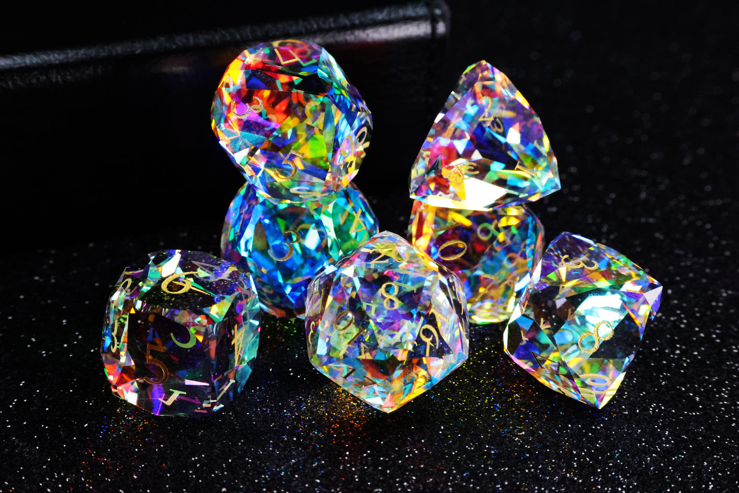 This set of dice is crafted from K9 prismatic glass, offering a crystal-clear texture. The diamond multi-faceted cutting technique enhances each die with a dazzling refraction effect, displaying a mesmerizing spectrum of colors under light.